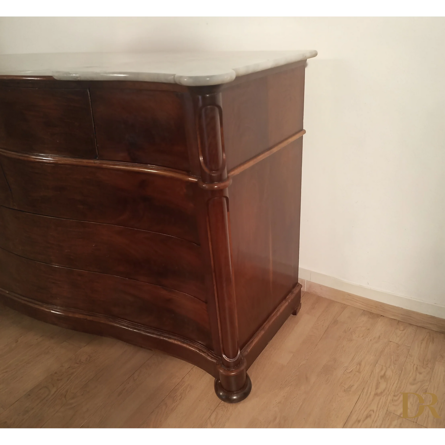 La cómoda napolitana Louis Philippe, realizada con fina pluma de caoba, es un mueble refinado y lleno de historia. Con una elegante cubierta de mármol blanco de Carrara, esta distintiva pieza del siglo XIX logra un equilibrio perfecto entre estética y funcionalidad. Su frente curvo inteligentemente diseñado presenta cuatro cajones que no solo aumentan la utilidad de la cómoda sino que también mejoran su impacto visual, convirtiéndola en una verdadera protagonista en cualquier ambiente. El estado general de este ejemplo de arte mueble es bueno, gracias a una cuidadosa restauración que ha conservado bien la belleza e integridad del mueble. La procedencia napolitana confiere un valor adicional a esta extraordinaria cómoda Luis Felipe, considerada uno de los mejores ejemplos de artesanía de la época. Cada detalle, desde la elección de los materiales hasta la artesanía, cuenta una historia, haciendo de esta pieza no solo un accesorio de decoración de alta gama, sino también una inversión cultural e histórica.