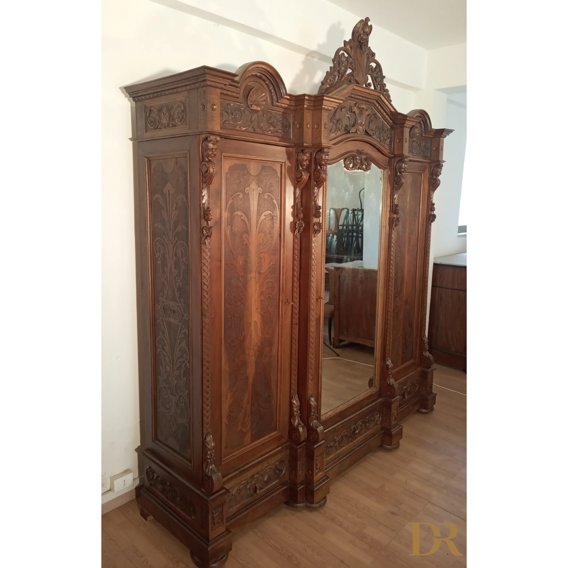 Guarda-roupa antigo em estilo renascentista, de aproximadamente 1880, uma peça única que incorpora a beleza e a elegância da arte do mobiliário italiano daquele período. Este guarda-roupa de 3 portas é feito inteiramente de nogueira maciça, conhecida por sua extraordinária qualidade e durabilidade, enquanto o interior é feito de álamo maciço, uma madeira mais leve, mas igualmente durável. A estrutura de nogueira é enriquecida por decorações esculpidas com motivos de querubins e detalhes esculpidos, todos executados com maestria em uma oficina de marcenaria na área de Nápoles, uma região famosa por sua refinada tradição artesanal, que prosperou entre o final do século XIX e o início do século XX.